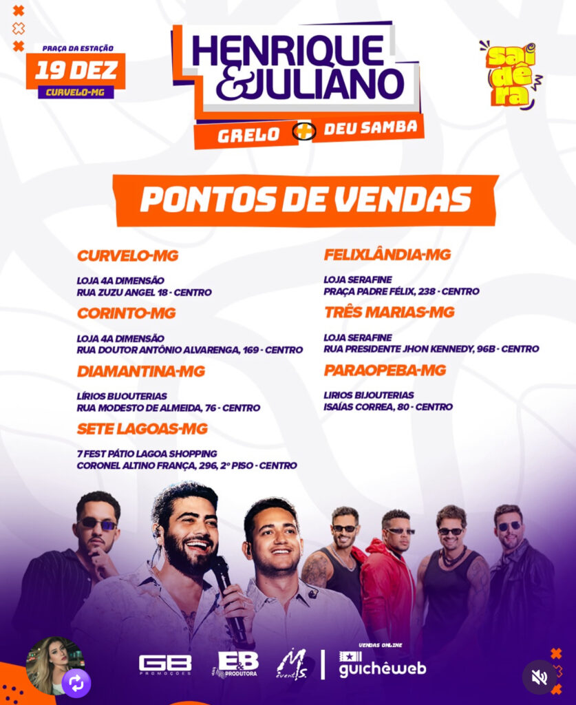 A cidade de Curvelo (MG) se prepara para uma noite de show-espetáculo com a dupla Henrique & Juliano. Com data marcada, estrutura em montagem e uma expectativa que já toma conta da cidade ,as vendas de ingressos foram iniciadas ontem e alcançaram um sucesso imediato, sinalizando que o evento promete ser um dos grandes da região em 2025.